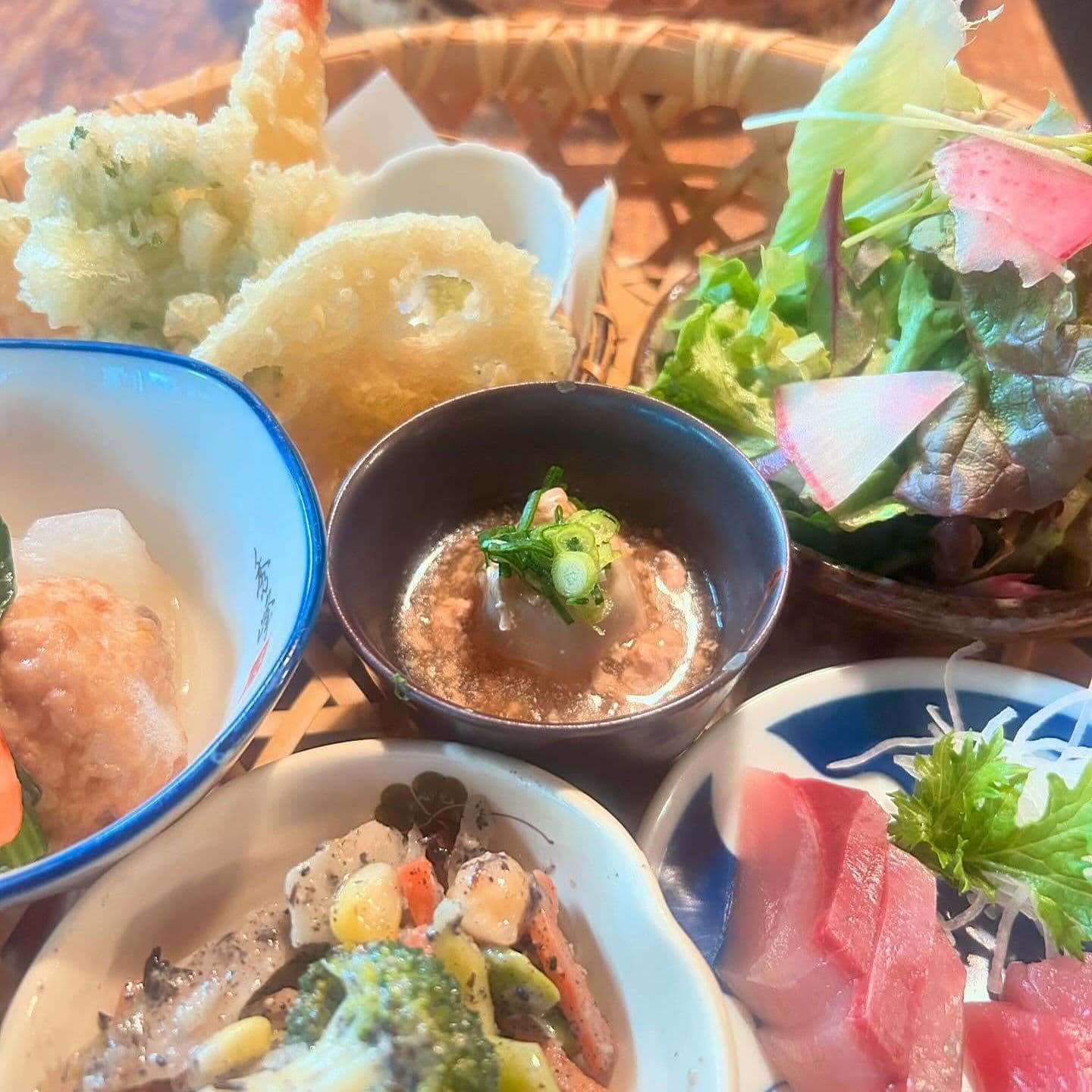 ほかにもみずみずしいサラダやたっぷりとしみた煮物など、おかずの入った花籠と土鍋ごはん、おかわり自由の自家製みそを使ったお味噌汁がセットになっています。