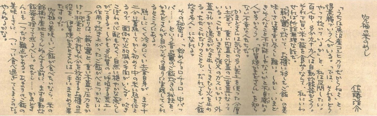 丹精込めて手間を惜しまず作ったお米を土鍋で炊き上げます。 ずっと昔女将さんのおばあちゃんちにはかまどがあったそうです。 かまどに炭をいれて次第に湯気が立ち込めてきて、お米のいい匂いがしてくるのを、かっぽう着姿のおばあちゃんの背中を見ながら待っていたそうです。 「始めちょろちょろ中ぱっば」と教えてくださったそうで、面白い言葉だなと幼心に覚えていたそうです。 そんなかまどで炊いたお米を忠実に再現してくれるのが土鍋炊きです。 少しずつじんわりと土鍋に熱が伝わり、火を落としてから土鍋の余熱でふっくらと炊き上げる。 炊き上がったお米は昔食べたかまどのお米にも負けないおいしさです。